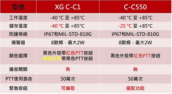 與同系列 C-C550 相比,XG C-C1 額外具備擴音功能、可編程緊急按鈕及警示燈,在功能完整性上更適合高強度特勤及消防用途。